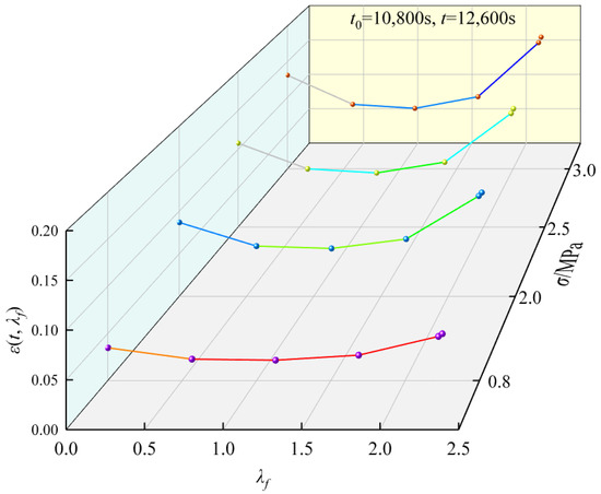 The relationship between the creep strain of fiber-reinforced asphalt composite concrete after unloading and the characteristic parameters of fiber amount obtained from Equation (12) is shown in Figure 6. It is evident that the residual creep deformation following unloading increases with increasing loading tension. As the characteristic parameter for fiber amount increases, the residual creep deformation first drops and subsequently increases. The minimal residual creep deformation of fiber-reinforced asphalt composite concrete has a fiber amount characteristic parameter value of around 1.13 for the same loading and unloading period and varied loading stress circumstances. Currently, fiber-reinforced asphalt composite concrete has a superior capacity for self-healing creep deformation. Additionally, Equation (12) demonstrates that damage to the fiber-reinforced asphalt composite concrete material and residual creep deformation after unloading increase with the length of the creep loading time.