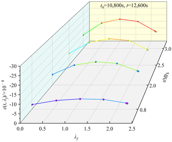 Figure 5 depicts the link between the creep rate during the loading stage and the characteristic fiber amount values determined from Equation (8). The smallest value of the creep rate is reached when the fiber amount characteristic parameter is 1.68; the higher the stress, the higher the creep rate. As can be seen, the creep rate first reduces and then increases as the fiber amount characteristic parameter increases. Additionally, Equation (8) demonstrates that as loading time increases, the creep rate decreases.