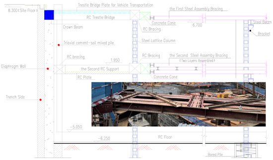 Around the foundation pit, the reinforced concrete diaphragm walls and the triaxial cement-soil mixing piles form the lateral enclosure, steel assembly bracing are used in the horizontal direction, and some reinforced concrete purlins are used as trestle bridges on the earthwork transportation path. Figure 1 shows the driving route of earthwork trucks at the foundation pit construction site and the plane layout of the steel assembly bracing. The transportation channel for the earthwork truck is closest to the steel assembly bracing T01. As can be seen from Figure 2, there are upper and lower steel assembly internal bracings along the height direction of the foundation pit, and both ends are supported on the reinforced concrete trestle bridge for earthwork truck transportation. In addition, vertical steel lattice columns are set at a certain distance in the foundation pit to provide vertical support along the length direction of the steel assembly bracing.