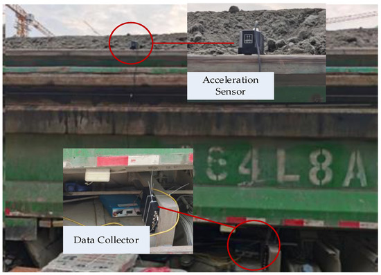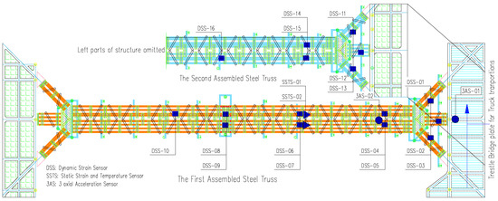 As can be seen in Figure 3, the vibration acceleration sensors are fixed on the beam for the reinforced concrete trestle, while all kinds of measuring points are installed on the upper flange of the H-beam for the steel assembly bracing. Ten dynamic strain measuring points (DSS-01~DSS-10) are arranged on the first steel assembly bracing, and six dynamic strain measuring points (DSS-11~DSS16) are arranged on the second steel assembly bracing. Two static strain measuring points (SSTS-01, SSTS-02) are arranged to master the static strain and steel temperature of steel assembly bracing. At the same time, acceleration sensors, numbered with 3AS-01 and 3AS-02, are arranged on the trestle bridge and steel assembly bracing, respectively. It is noted that the sampling interval of static strain and temperature data is 5 min; the sampling frequency of dynamic strain is 50 Hz; and the sampling frequency of vibration acceleration is 200 Hz.