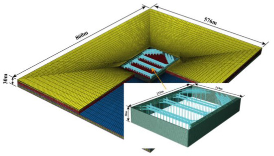 In order to consider the influence of the surrounding soil layer on foundation pit structure, the length and width of the soil layer are taken as four times that of the foundation pit size, and the thickness of the soil layer is taken as twice that of the foundation pit depth. The total size of the ABAQUS finite element model is set as 576 m × 860 m × 30 m [22]. An eight-node C3D8R volumetric element is adopted for the soil layer and the number of elements is about 334,000. Considering that there is a concrete trestle bridge, concrete crown beam and diaphragm wall around the steel assembly bracing to be considered, a linear elastic model is adopted to simplify the calculation of soil layer parameters, which are shown in Table 1. In the process of calculation and analysis, the soil layer adopts C3D8R element type with hourglass control. At the same time, in order to improve the calculation accuracy, the soil elements inside and around the foundation pit are encrypted, and the size of the elements far away from the foundation pit is gradually increased to improve the calculation speed. The bottom boundary of soil is constrained by three-dimensional displacement, the side of soil is constrained by normal displacement, and the upper surface is free. Because the mechanical properties of soil are usually little affected by environmental temperature, the temperature of the soil is set at a normal temperature of 25 °C.