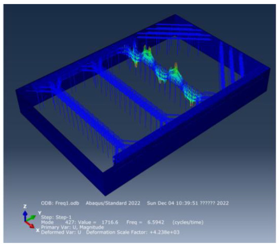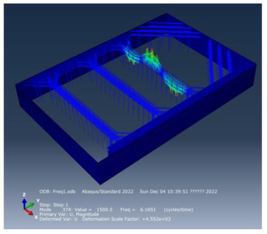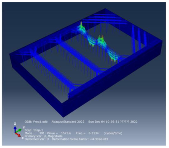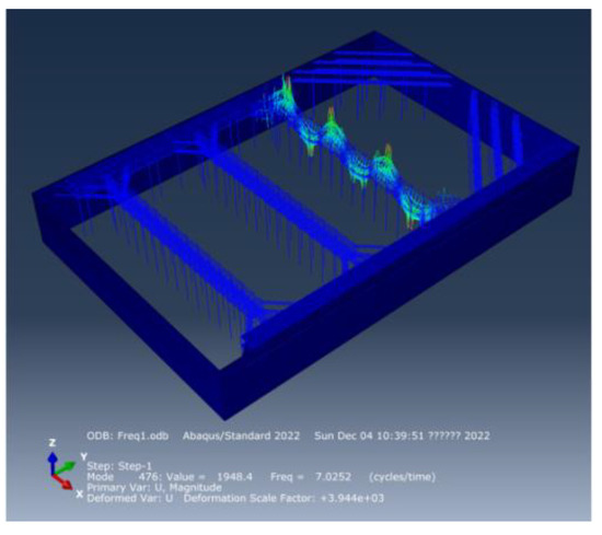 With the help of engineering experience, it can be concluded that the stiffness of reinforced concrete diaphragm walls, cement mixing pile and reinforced concrete brace around the wall is much larger than the vertical stiffness of steel assembly bracing, and the low-order natural frequency of the foundation pit support system should occur in the steel assembly bracing, which has been also proved by numerical results. The low-order vertical natural frequencies of the steel assembly bracing system are mainly concentrated in (6.16 Hz~7.02 Hz), and the first four natural frequencies and the corresponding vertical vibration modes are shown in Figure 5, Figure 6, Figure 7 and Figure 8 as follows.