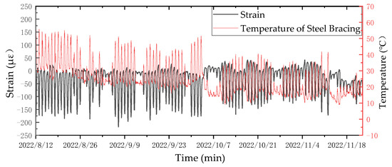 Temperature–strain diagram of steel assembly bracing during monitoring period (12 August to 22 November 2022).