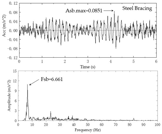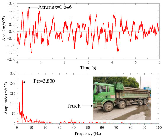 As for the vertical vibration problem of steel bracing, since the site is in the construction stage, the vibration sources of structure include: (1) the vibration caused by earthwork truck running; (2) the vibration caused by pouring concrete in the foundation pit bottom plate; (3) the vibration caused by tower crane running and hoisting construction materials, and vibration caused by various construction machines and tools. Frankly speaking, it is extremely difficult to accurately analyze the steel assembly bracing under the action of each vibration source. The multi-day vibration monitoring data show that the vertical vibration of the reinforced concrete trestle bridge and steel assembly bracing increases obviously when the earthwork truck passes through the trestle bridge, which further shows that the earthwork truck passing through the trestle bridge is the main reason for the significant vibration of T01. Video monitoring of the speed of earthwork trucks on the trestle is about 10 km/h. The truck is fully loaded and the roof soil layer is neatly covered, and the average total mass weighed is 20,000 kg. In order to obtain the moving load of the truck running on the trestle, a vertical vibration sensor is installed on one of the trucks to collect the vertical vibration monitoring data of the vehicle. The vibration action during the driving process of the vehicle is shown in Figure 10 and Figure 11 below. The vertical vibration responses of trestle ground vibration acceleration monitoring point 3AS-01 and steel support vibration acceleration monitoring point 3AS-02 at the same time are shown in Figure 12 and Figure 13. It can be seen from the vibration time history and frequency spectrum curves in Figure 10 and Figure 12 that the first-order frequency (Figure 10) of the vehicle action when the truck passes through the concrete trestle is basically consistent with the first-order dominant frequency of the vertical trestle response. The trestle vibration contains forced vibration components, and the frequency components are complex. The first frequency of the vibration response in Figure 13 is 6.661 Hz, which is close to the vertical natural frequency of the bracing in Figure 7 of numerical analysis. The vertical vibration of the bracing is mainly caused by resonance.