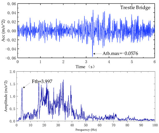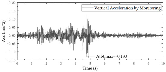 During numerical analysis, the vibration effect of earthwork truck as the unique vibration source is considered and the static and dynamic strain of steel assembly bracing at the highest temperature difference are only considered. With regard to the vibration calculation input, the amplitude modulation input model of Figure 10 is calculated based on the maximum value Atbt.max of the vibration response of the concrete trestle bridge (purlin) in Figure 14, such that Atbt.max of Figure 12 is equal to Atbt.max of Figure 14. The time history curve of vehicle vibration acceleration after amplitude modulation in Figure 10 was taken as the calculation input.