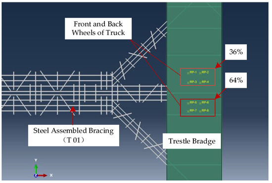 In order to simulate the influence of the vertical vibration of vehicles, eight concentrated forces are set in this model to represent the mass distribution of vehicles on the trestle bridge. The numerical values are calculated according to the vehicle weight and the vehicle mass distribution percentage. The first half of the earthwork vehicle accounts for 36% of the total mass of the vehicle, and the second half accounts for 64% of the total mass of the vehicle, and then the mass is evenly distributed to the concentrated force in the area located. During numerical analysis, the total mass of the vehicle is taken as 20,000 kg, and the front and rear wheels of the vehicle are distributed in proportion, in which the concentrated forces exerted by the front wheels RP-1 to RP-4 are all 1800 kg, and the concentrated forces exerted by the rear wheels RP-5 to RP-8 are all 3200 kg, as shown in Figure 15. The time history curve of vehicle vibration acceleration after amplitude modulation is assigned as the amplitude curve which is multiplied by the above mass of the vehicle to obtain the dynamic load-time history curve. Finally, the dynamic load action can be analyzed. It is assumed that the most unfavorable working condition is considered, that is a linear combination of the maximum temperature difference of steel assembly bracing and the maximum vibration response amplitude of the trestle which occur at the same time.
