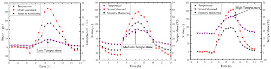 According to the change of steel assembly bracing with temperature for more than 100 days in Figure 9, the surface temperature changes of section steel collected in typical weather environments of low temperature, medium temperature and high temperature are selected and input into the finite element model, and the temperature influence analysis of static strain at the SSTS-01 measuring point of T01 steel assembly bracing is carried out. SSTS-01 steel surface temperature, monitoring strain, and model in-situ calculated strain are shown in Figure 16, and monitoring strain and calculated strain information are listed in Table 3.