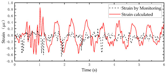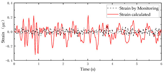 Then, the finite element dynamic analysis is carried out under the vibration action of the earthwork truck after amplitude modulation. The total time of model calculation is 6 s, the step size is 0.005 s, and the sampling frequency of the field vibration sensor is 200 Hz. It is assumed that the temperature of steel is approximately in a stable state of 50.6 °C during the period when the earthwork truck passes through the trestle bridge. As shown in Figure 17, Figure 18, Figure 19 and Figure 20 below, the monitoring data of the dynamic strain of typical position number DSS-06 (the same position as static strain SSTS-01), DSS-10, DSS12 and DSS-14 of T01 are compared with the calculation results at the same point of the model (the monitoring data of dynamic strain of other positions are in Supplementary Materials).