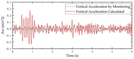 Figure 21 shows the vertical calculated acceleration response and monitored acceleration response of measuring point 3AS-02 on steel assembly bracing. The acceleration response is less than the calculated results. It should be noted that the vertical vibration of T01 steel assembly bracing causes complaints from on-site construction technicians, which can be clearly felt during the construction. In order to understand the influence of the vibration of steel assembly bracing on the walking comfort of technicians, according to ISO 2631-1:1997, the vertical frequency-weighted vibration acceleration is calculated as aw = 79.30 dB for Figure 21. Obviously, the vertical frequency weighted acceleration aw is really large and it is reasonable for technicians to complain about the insecurity of bracing vibration [24].