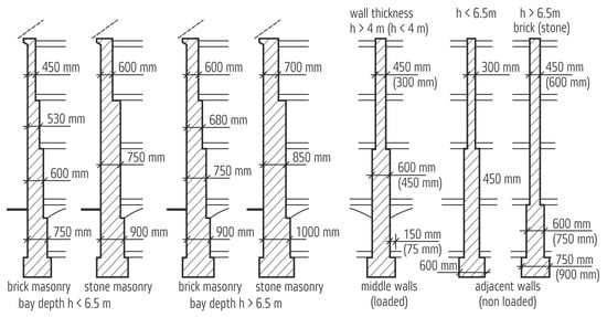 Urban residential masonry buildings were characterized by massive walls, most often implemented as brickwork with mixed masonry and especially with solid brickwork. From the second half of the 19th century onwards, on the top floors was required a wall thickness of at least 45 cm, and this increased downwards (Figure 2). At the turn of the 19th century, and especially from the beginning of the 20th century, there was an increase in the number of buildings whose walls were already composed of hollow burnt bricks on the upper floors or, later, of brick cavity blocks comprising lightweight concrete, etc. (cinderblock or slag pumice). Brick walls and pillars of greater thickness, usually over 70 cm, were often constructed as multi-layered. Lime mortar was predominantly used as a bonding material until the middle of the 19th century, followed by an increase in the use of lime-cement mortar in the next period, and then the use of cement mortar in the 20th century [].