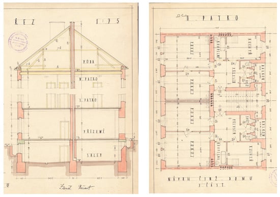 With the development of urban construction, the need for regulation has also grown. Throughout the 19th century, some of the most important areas of building law were clarified, especially in relation to fire safety []. The building codes determined, for example, the maximum height of buildings and the design of ceiling structures, staircases or roofs, etc.; these were valid until the end of the Austro-Hungarian Monarchy and were largely adopted in the legal system of Czechoslovakia after the establishment of the independent state (1918). However, buildings were still designed on the basis of the builder’s experience, with the thickness of the vertical load-bearing structures determined by empirical formulae depending on the number of storeys, the height of the storey and the depth of the wing.