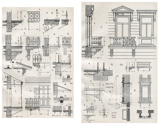 Balconies, pavilions and bay windows were also characteristic elements of the town’s architecture, and their design (dimensions) had to meet the requirements of the building regulations (Figure 4). In most cases, the structure of balconies and pavilions consisted of arches or slabs (stone, ceramic, or wooden) placed on brackets or beams. The bay windows often dominated the façade or corners of the house. They were constructed with a supporting structure consisting of an iron (‘traverse’) frame, the beams of which were, for example, extended beams of the ceiling structure, or special beams anchored into the central walls. The 30–45 cm thick perimeter walls of the bay windows were made of perforated and lightened hollow bricks, in some cases supplemented with heraclite or pressed cork boards (to improve thermal insulation properties).