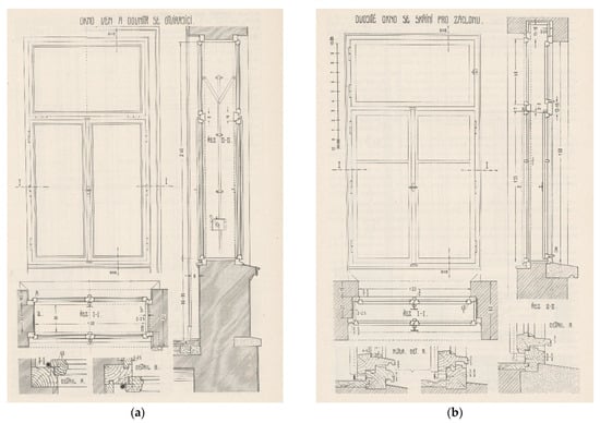 The simplest window was a single window frame. In connection with the greater demands on the thermal comfort of interiors, from the beginning of the 19th century onwards, second window frames were first added to existing windows (so-called winter windows), and in new buildings, double glazing was introduced (Figure 5b). From the mid-19th century, the double window was the standard for heated interiors, while the use of the single window was restricted to unheated and service areas (e.g., corridors, staircases, lavatories, pantries, workshops, etc.).