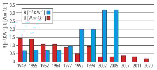 Since 1949, when CSN 1450 [] came into force and defined the value of the thermal resistance of the envelope structure, the requirement for the value of the thermal resistance of the envelope structure (according to the current CSN 73 0540: 2011) has increased by at least 4 times (not considering the requirement for passive standard from 2020). Figure 6 and Figure 7 show a comparison of the thermal performance of the envelope masonry wall with the evolution of the standard’s requirements. The first standard that formulated requirements for the thermal insulation properties of building structures in the Czech Republic, CSN 73 0540 “Thermal properties of building structures and houses”, was published in 1964. The minimum value of the thermal resistance of the perimeter wall in this standard was based on the provisions of the Building Code for the Capital City of Prague from 1886, which required that perimeter wall structures should be at least 450 mm thick []. This thickness corresponds approximately to a thermal resistance of RN = 0.6 m2K/W, which is a satisfactory value as required by that standard.
