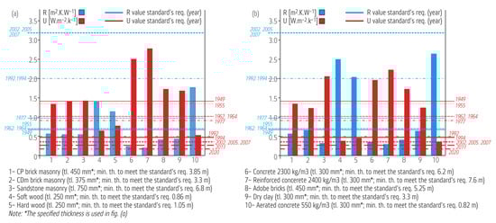 (a) Comparison of thermal properties (thermal resistance, heat transfer coefficient) for selected types of vertical envelope structures with the standard‘s requirement; (b) comparison of thermal properties (thermal resistance, heat transfer coefficient) of vertical envelope structures 450 mm thick composed of selected materials with the standard‘s requirement. (Analysis by the authors).