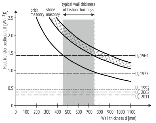 Requirements for heat transfer coefficient, according to CSN 73 0540 and CSN 73 0540-2 (brick masonry ρ = 1800 kg/m3, λ = 0.86 W/m. K, stone masonry ρ = 2400–2800 kg/m3, λ = 1.4–1.7 W/m. K). (Analysis by the authors).