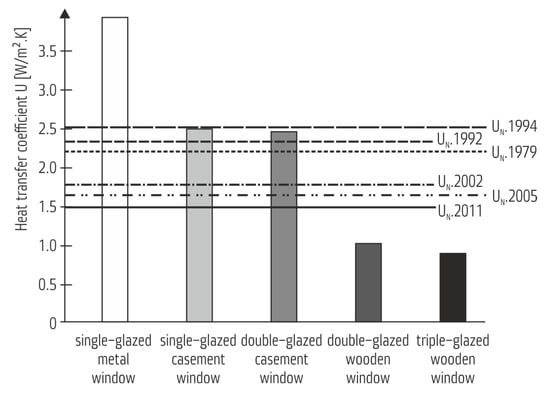 The higher energy consumption of masonry residential buildings is not only due to the inadequate thermal insulation properties of the masonry external walls, but also to the often inadequate properties of casement and dual-timber single-glazed windows. Improving the thermal insulation properties of windows, using new infill structures, and the effective refurbishment and repair of existing openings can make a significant contribution to improving the energy performance of these buildings (Figure 9). However, when addressing this issue, it is necessary to consider not only the properties of the windows themselves, but also the related structures [,,]. The technical parameters of window infills that need to be evaluated mainly include the heat transfer coefficient, airtightness, air permeability and watertightness.
