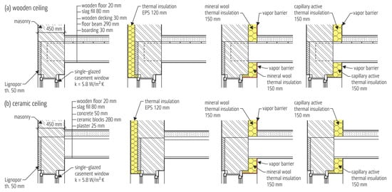 Variants of models for hygrothermal analysis: (a) external wall with window lintel and wooden ceiling structure—without insulation, with external insulation, with internal insulation and vapour barrier and with capillary active internal insulation; (b) external wall with window lintel and ceramic ceiling structure—without insulation, with external insulation, with internal insulation and vapour barrier and with capillary active internal insulation. (Analysis by the authors).
