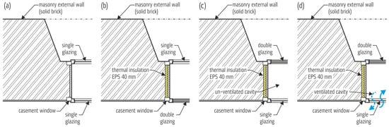 Variants of models for hygrothermal analysis: (a) original dual wooden window, plastered lining without thermal insulation; (b) modified dual window with double glazing in the outer sash, insulated lining with plaster; (c) modified dual window with double glazing in the inner sash and with unventilated cavity; (d) modified dual window with double glazing in the inner sash and with ventilated cavity.
