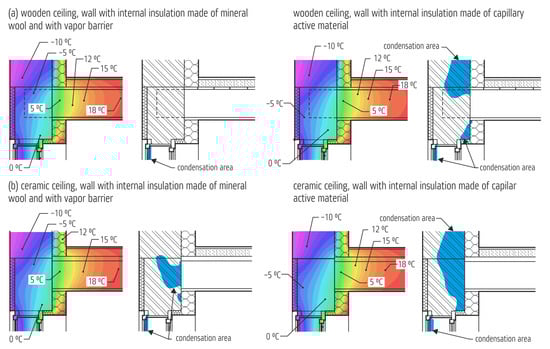In the case of internal thermal insulation, two different models were studied. The first one utilizes thermal insulation composed of mineral wool together with vapour barrier on the inside of the structure. In this case, for both variants of ceiling structure (wooden and ceramic), the temperature drop was even more significant than for the non-insulated structure (the external wall structure is effectively insulated from the indoor source of heat), so the appropriate conditions for water condensation appeared in a wider area of the historic structure. However, due to the vapour barrier, the humidity donation from the interior to the structure was limited. In both cases, there was a problematic spot in the place of the external wall and ceiling structure connection, which presented a discontinuity in the vapour barrier, allowing some moisture access into the structure. The water condensation area was bigger in the case of the ceramic ceiling due to the material properties of the ceiling structure (Figure 15).