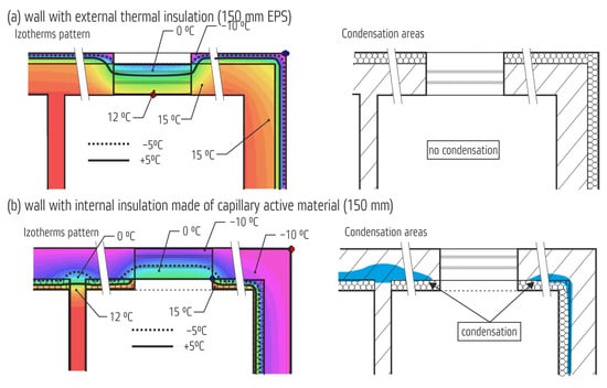 Results of hygrothermal analysis: (a) external wall with window lintel and wooden ceiling structure for the variant without insulation; (b) external wall with window lintel and ceramic ceiling structure for the variant without insulation. (Analysis by the authors.) By insulating the structure with an external insulation system, the thermal and humidity regime of the external masonry wall is significantly improved, the overall thermal comfort of the internal environment is improved, and the energy consumption is reduced (Figure 14). Water vapour condensation is limited to the usual point at the interface between the thermal insulation and the thin plaster; no surface condensation occurs. Again, a small amount of water condensation occurs on the outer sash of the wooden dual window. (Analysis by the authors.)