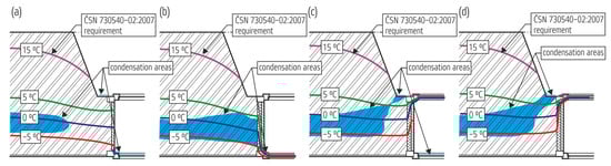 A comparison of the isotherms’ pattern and the size of the condensation zones for the different dual window solutions is shown in Figure 17. It is clear from the graphical outputs that water vapour condensation occurs on the inner surface of the outer single glazing at very low outside temperatures, even in the case of a traditional dual window solution (Figure 17a). The dual window solution with double glazing in the inner frame results to be very similar—if very tight new frames were used for the inner glazing, the rate of water vapour condensation could even be slightly lower (Figure 17c). Clearly, the most favourable results can be obtained for a solution with double glazing in the outer sash, which should be designed and implemented as standard (Figure 17b).