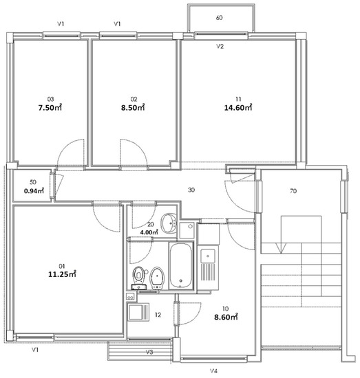 Most of the apartments were similar and composed of an entrance with a corridor (Division 30) linking the remaining divisions. At its end, a small storeroom (Division 50) was set. The kitchen (Division 10), bathroom (Division 20), and laundry (Division 12) were close to each other and on one side together with the largest room (Division 01). Originally, the bathroom was divided with a wall and door to set a partition between the space for the toilet and bathtub and the space for the wash basin. This division was where more differences were identified from apartment to apartment. This situation led to adjustments in the scanning process, as is further detailed. On the other side, two smaller rooms (Divisions 02 and 03) and the living room (Division 11) made up the rest of the apartment spaces [91]. In total, each apartment is composed of 9 divisions (bathroom spaces might lead to 10), as presented in Figure 1.
