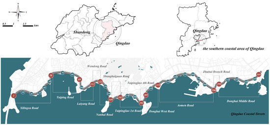 As a typical coastal city in the north of China, Qingdao is surrounded by the sea on three sides, with the pattern of a mountain-sea city. The landscape resources, both natural and cultural, are rich. The study area is located in the southern coastal area of Qingdao (Figure 1), from Xilingxia Road in the west to Donghai Middle Road in the east, with a total length of 17.15 km. Qingdao Coastal Streets are an important tourist area. Street greening is the most important landscape element with high research value in Qingdao Coastal Streets. The most critical issues in the study of Qingdao Coastal Street are as follows: (1) efficiently and accurately quantify the analysis of the GVI and VICO in coastal streets; (2) a comparative analysis of the spatial heterogeneity of the GVI and VICO in various types of districts; and (3) study the relationship and influence mechanisms between the GVI and VICO.
