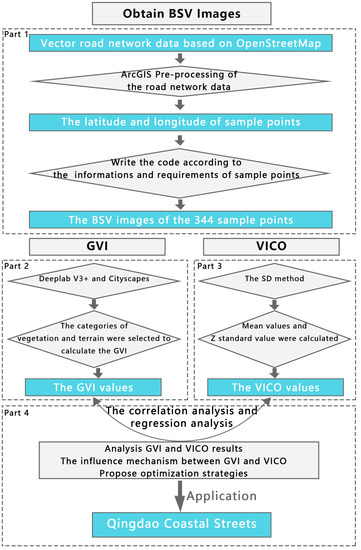 This study still has some limitations: The BSV images of Qingdao Coastal Streets were collected in summer, but some sections had plants with seasonal changes. In future studies, we will collect representative samples from the four seasons to conduct all-season research. The overall greening quality was high, and the landscape was attractive and distinctive in Qingdao Coastal Streets. Considering the types of coastal and urban environments, the regression equation may not be fully applicable to all coastal streets; VICO evaluation can be combined with other methods, such as recording video, VR panorama, point cloud, etc. It would make the evaluation result more accurate and precise. Except for GVI and VICO, more factors should be added, and a comprehensive study will be conducted in future research, such as microclimate, noise interference, and the willingness to walk. That would enhance the greening design and improve the public’s health in urban coastal streets.