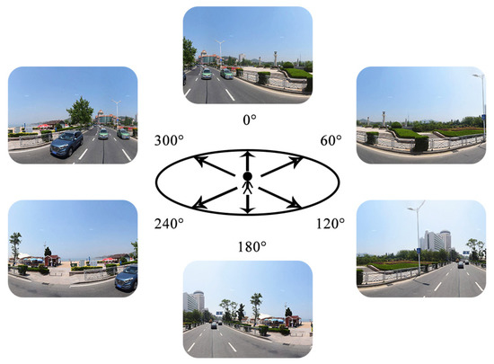 Figure 2 shows the data collection, processing, and analysis process for this study. In the study, Baidu Street View (BSV) images were used as the main data source. Baidu Map is the biggest streetscape data provider in China. The users can make corresponding download requests to Baidu Map (https://map.baidu.com/, accessed on 30 March 2022) by setting different API parameters, so as to obtain the street view image needed for research. Based on OpenStreetMap, the vector road network data of Qingdao Coastal Streets was obtained and imported into ArcGIS10.3 to delete and simplify the road network. With the help of “Split line At Vertices” (one of the edit functions) and the “Feature Vertices to Points” tool, the street sampling points with a distance interval of 50 m were generated. And the latitude and longitude coordinates of the sampling points were obtained with the help of the “Add X Y Coordinates” tool. After verification, 344 coastal street sample points were obtained. In order to better simulate the actual pedestrian perspective [117], the following parameters for the BSV image were set: size: 960 × 720; pitch: 0 degree; heading: 0, 60, 120, 180, 240, and 300 degrees; location: Baidu longitude and latitude coordinates of the sample point converted by the coordinate conversion program. Through the automatic image crawling program written in Python, BSV images of 8 angles of each sample point were obtained (Figure 3). The street view images were taken from May to July 2015–2020. A total of 2752 valid BSV images were obtained.
