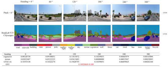 Therefore, the DeepLabV3+ and CityScapes datasets were used to identify landscape elements in the BSV image. The CityScapes dataset can identify 19 categories. It is one of the most authoritative and professional evaluation sets at present. The categories of vegetation and terrain were selected to calculate the GVI of the sample points. The formula for calculating GVI is as follows: