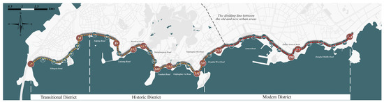 According to the previous research results of Qingdao Coastal Streets [124], Qingdao was divided into three parts, namely, historic urban area, central urban area, and eastern new area. And according to the difference in architectural styles and features, Qingdao Coastal Streets were divided into three types (Figure 5): transitional district (the sample points 1–67), historic district (the sample points 68–206), and modern district (the sample points 207–344). Then, the GVI and VICO in the three types of Qingdao Coastal Streets were analyzed and discussed. Meanwhile, the overall Qingdao Coastal Streets were divided into 12 sections. Then, the GVI and VICO in the three types of Qingdao Coastal Streets were analyzed and discussed. Table A1 shows GVI and VICO values for each sample point.