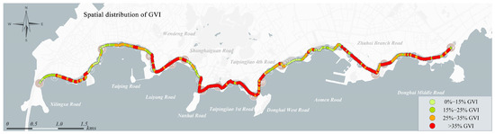 Figure 7 shows the spatial distribution of GVI in Qingdao Coastal Streets. It showed that the sample points with GVI higher than 35% were concentrated in the historic district and the eastern modern district. Except for Taiping Road, Nanhai Road, and the western Aomen Road, the GVI of other streets in the historic district and the modern district was higher than 35%. The sample points with 25~35% GVI were concentrated in the middle of Xilingxia Road, Taiping Road, and the Donghai Middle Road. Most of them were close to the sample points, with GVI higher than 35%. The sample points with 15~25% GVI and 0~15% GVI were mostly concentrated in the eastern and western transitional districts and the western modern district.