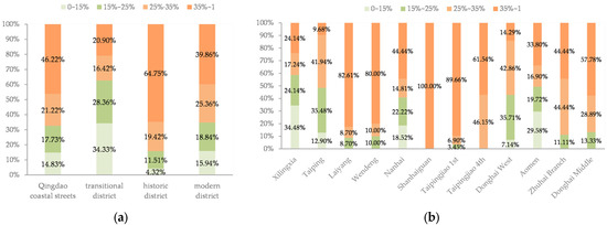 The proportion of each GVI level is shown in Figure 8. As Figure 8a shows: The best green grade (GVI 35–100%) accounted for the highest share in the historic district and modern district, while in the transitional district, the worst green grade (GVI 0–15%) accounted for the highest share, and the sample points with 0~25% GVI were more than 50%. It indicated that the transitional district was the primary area, which should improve street vegetation and urban greening. In the modern district, the 33.7% sample points were lower than 25% GVI. They were concentrated in the western modern district, and they should be valued. (3) There were no low-GVI streets in the historic district. The GVI of only six sample points was lower than 15%. They were sample points 85, 125, 127, 132, 135, and 136. It accounted for only 4.3% of all sample points in the historic district. The sample points with GVI between 15% and 25% accounted for 11.5% of the historic district. In addition, there were 64 sample points with GVI higher than 50% in the three types of districts, accounting for 18.6% of the total sample points in Qingdao Coastal Streets. Among them, the historic district accounted for 68.75% of the 64 sample points, the modern district accounted for 18.75%, and the transitional district accounted for 12.5%. The highest GVI (81.1%) was sample point 287, located in the modern district.