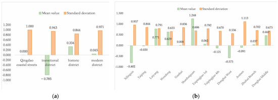 After standardizing the VICO data, the mean and standard deviation of the three district types and 12 roads were calculated (Figure 9). By comparing the average values (Figure 9a) of the three types of districts, it showed that VICO-historic (0.334) > VICO-modern (0.045) > VICO-transitional (−0.785). The VICO-historic was the best, which was far higher than the others. The second was the VICO-modern, which was close to the mean value of the overall coastal street. The VICO-transitional was a very poor score. In addition, the standard deviations of the three types of districts were high. It indicated that the fluctuation range of VICO was large.