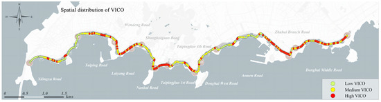 Figure 10 shows the spatial distribution of VICO in Qingdao Coastal Streets. The high VICO was mainly distributed in the historic district and the eastern modern district, especially in Laiyang Road, Wendeng Road, Shanhaiguan Road, the eastern Aomen Road, and the eastern Shanghai Middle Road. The distribution of high VICO was consistent with the high GVI. The medium VICO had a scattered distribution in the historic district and modern district, especially in Taiping Road, Nanhai Road, the eastern Taipingjiao 1st Road, and Taipingjiao 4th Road. The low VICO was mainly distributed in the transitional district and the western modern district, especially in Xilingxia Road, Donghai west Road, and the western Aomen Road.