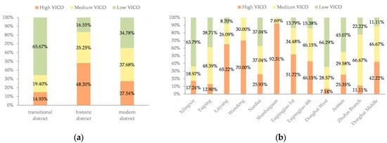 The proportion of each VICO level is shown in Figure 11. As Figure 11a shows: in the transitional district, 65.7% of sample points had low VICO, and more than 50% of the sample points had low comfort perception for the public; in the historic district, 48.2% of the sample points had high VICO, nearly 50% of the street space was a comfortable walkable environment; in the modern district, medium VICO accounted for 37.7%, high VICO accounted for 27.5%, and low VICO accounted for 34.8%. The results revealed that the distribution of the three-level VICO was relatively balanced in the modern district.