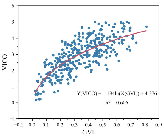 This study conducted Pearson correlation analysis and regression analysis on the GVI and the VICO of the 344 sample points in Qingdao Coastal Streets by SPSS25.0 (Table 3).