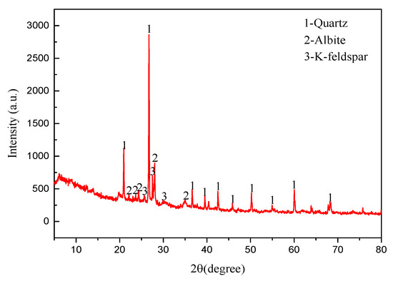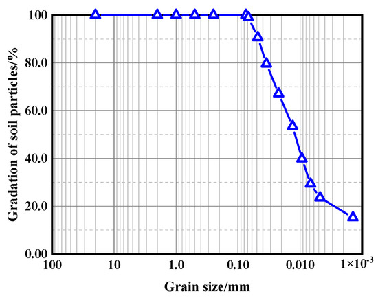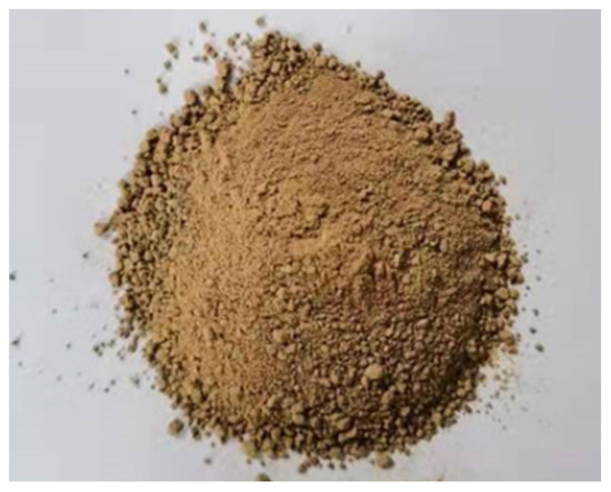 The test soil was collected from a side slope in Changchun City, China, and its fundamental properties are listed in Table 1. Figure 1 shows the appearance of the test soil, and Figure 2 shows the original spectrum obtained in the XRD test. The primary components are quartz, sodium feldspar, and potassium feldspar. The grain particles are shown in Figure 3.