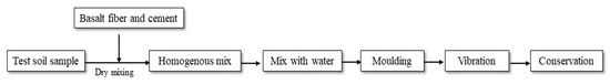 Cubic specimens were prepared based on the JGJ/T233-2011 Specification for Mix Proportion Design of Cement Soil [28], with dimensions of 70.7 mm × 70.7 mm × 70.7 mm. The cement content was 10%. To produce the BFRCS specimens, basalt fibers, cement, and soil were mixed for 3 min. Water was then added, and the mixture was stirred for 6 min. Finally, the mixture was molded by 70.7 mm2 cubic molds and shaken for 3 min using a shaking table. The specimen preparation flowchart is shown in Figure 5.