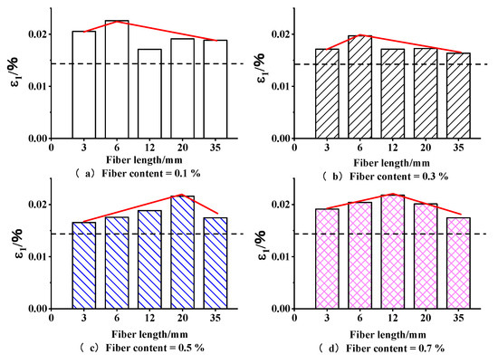 Damage strain is defined as the strain corresponding to the peak stress in the stress–strain curve (ε1). Figure 6a–d shows the variations in the damage strain versus the fiber length for the specimens with varying fiber contents, with the dashed line representing the value of the damage strain of the cemented soil without fibers. Figure 6 shows that the damage strain values of the specimens under different reinforcement conditions are higher than those of the specimens without fibers, indicating that the admixture of basalt fibers can improve the deformation resistance and toughness of the cemented soil. The damage strain curves tended to increase first and then decrease with an increase in the fiber length. The maximum value of the damage strain occurred in the case of the 6 mm fiber length, when the fiber contents were 0.1% and 0.3%, as well as the 20 and 12 mm fiber lengths, when the fiber contents were 0.5% and 0.7%. In conclusion, the damaged strain reached its maximum at a fiber content of 0.1% and a fiber length of 6 mm.