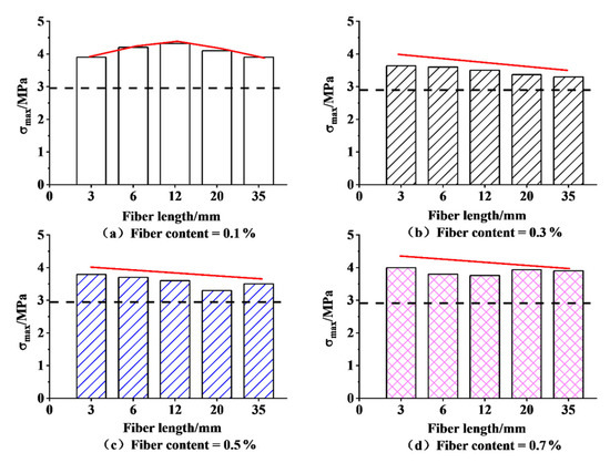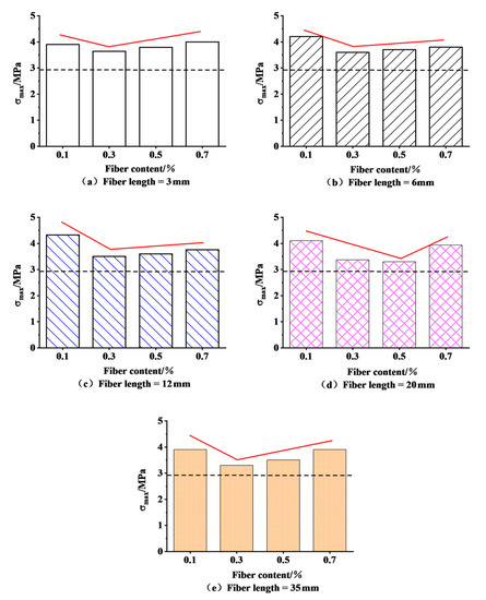 Figure 9a–e shows the variations in the peak strength of the specimens with different fiber contents and fiber lengths. Figure 9 shows that the peak strengths tended to increase and then decrease with an increase in the fiber content for all the fiber lengths, while for all of the fiber lengths a fiber content of 0.1% resulted in the most noticeable improvement in the peak strength of BFRCS.