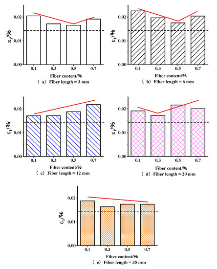Figure 8a–e shows the variations in the damage strains of the specimens with different fiber contents and fiber lengths. The dashed lines in the figure show the damage strain values of the cemented soil without the addition of fibers. From Figure 8, we can observe that the damage strain curves tended to decrease first and then increase with an increase in the fiber content when the fiber lengths were 3, 6, and 12 mm. Furthermore, when the fiber lengths were 12 and 35 mm the damage strain curves tended to linearly increase and linearly reduce. The tendencies of the damage strain curves for the individual fiber lengths are not identical.