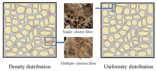 The effect of the fiber material on cemented soil reinforcement primarily lies in the adhesion between fibers and cemented soil in addition to the distribution law of fibers, where the adhesion is related to the soil quality, particle gradation, cement content, conservation age, and other factors. Moreover, the distribution law of fibers is closely related to fiber length, content, and other factors. Furthermore, the observation of a loaded specimen reveals that the fibers in the specimen appear to be clustered. The distribution cannot be fully dispersed, and even fibers dispersed in filaments have an uneven distribution, as shown in Figure 10. From a microscopic perspective, constructing a BFRCS constitutive model becomes relatively complex and challenging in light of the complex fiber arrangement. Figure 10 shows that when the fiber density is too high the reinforcing effect is diminished by a mechanism similar to the anchor group effect, whereas it is difficult to exert a reinforcing effect when the density is too low. Therefore, a suitable fiber content, length, and arrangement can enhance the strength of BFRCS.