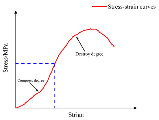 In this case, by defining the total number of microelements as , the number of pore microelements is. The damage effect, at this time, is believed to be much less than the effect of compression; therefore, the effect of compression is primarily considered. Since the compression stage basically occurs in the early low-strain stage, it is believed that its effect on the total number of units is negligible.