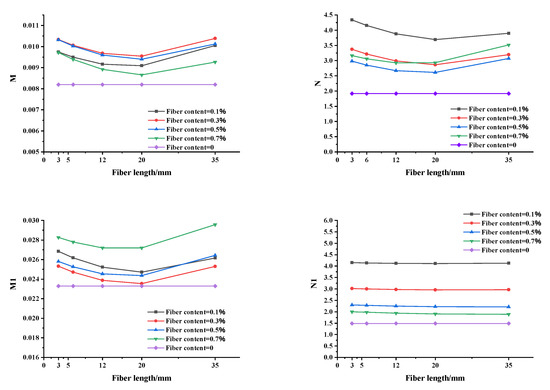 Figure 12 shows the results of the scale parameters and shape parameters, m, n, m1, and n1, at different stages according to the fiber content and fiber length. When the specimen is in the compression stage, m and n both increase and then decrease with an increase in the fiber content, while they first decrease and then increase with an increase in the fiber length. When the specimen is in the damage stage, m1 decreases and then increases with an increase in the fiber content and fiber length, and n1 decreases with the increase in the fiber content, while the effect of the fiber length is insignificant.