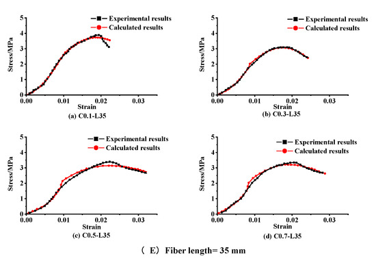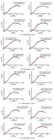 By substituting C and L into Table 6 and inserting m, n, m1, and n1 into Equation (16), the simulated constitutive relationships between different types of BFRCS with various fiber contents and lengths can be obtained (Figure 13). In Figure 13 the black lines represent the measured compressive stress-strain curves, while the red lines represent their respective theoretical curves for the same fiber content and length. The theoretical curve based on the presented damage model is similar to the test results, indicating that the Weibull distribution is a sound indicator of BFRCS strength and that the presented damage model is applicable to BFRCS.