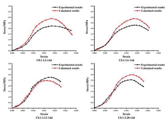 The curing of BFRCS for 14 days was tested in the same way as the curing of BFRCS for 28 days. By substituting C and L into Table 6 and inserting m, n, m1, and n1 into Equation (16), we can obtain the simulated constitutive relationships between different types of BFRCS with various fiber contents and lengths subjected to curing for 14 days (Figure 14). In Figure 14 the black lines represent the measured compressive stress-strain curves and the red lines represent the stress-strain curves calculated by the constitutive model.