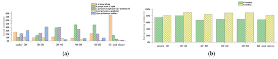 (a) Probability of differently aged people’s activities in winter; (b) probability of heating by people of different ages in summer and winter. Under 20 years old: n = 154; 20.30 years: n = 221; 30.40 years: n = 102; 40.50 years: n = 387; 50.60 years: n = 131; over 60 years old: n = 135 (n refers to the number of people within this age bracket who answered this questionnaire).