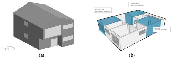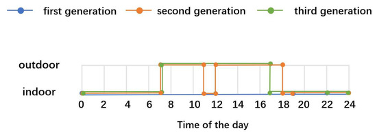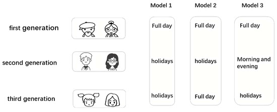 As shown in Figure 4, through the survey questionnaire of the actual situation, the three most common family models were selected. Due to the phenomenon of population outflow, the most common scenario in the Zhejiang Province region is first-generation residents living alone, while the second-generation residents go out to work and return home on holidays or New Year, and the third-generation residents go out to school or work, returning home for winter and summer vacation or holidays. (This means that in the mock-up’s schedule, the person is in the room is during summer and winter hours and holidays, while the rest of the time, they are not in the building, which means that no energy is used, and the room is in a natural ventilation mode).